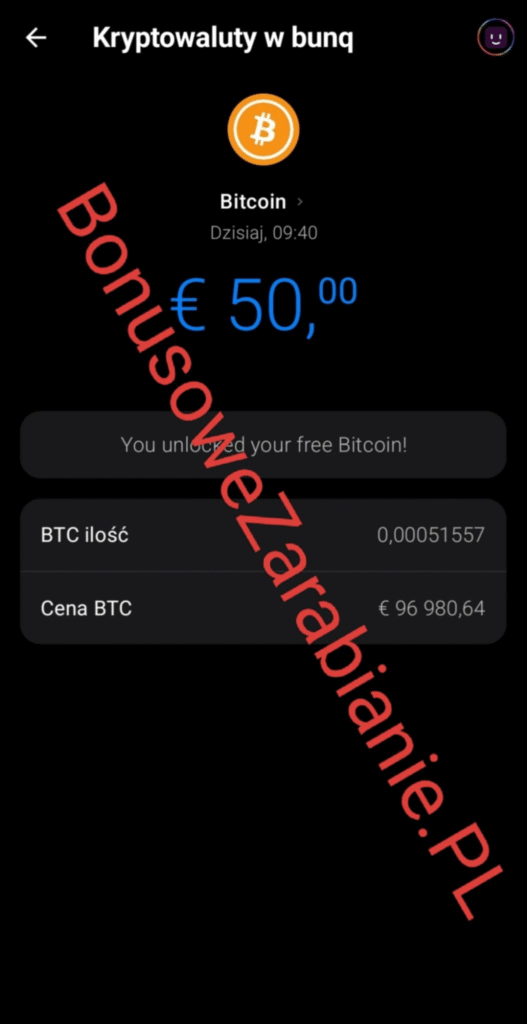 - Po zakupie kryptowaluty otrzymujesz od razu bonus 50€ w BTC od Bunq.