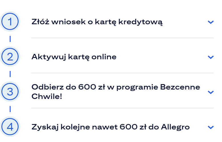 4️⃣ Przez pierwsze 6 miesięcy dokonaj kartą kredytową przynajmniej 5 transakcji za pomocą Apple Pay lub Google Pay na łączną kwotę min. 200 zł miesięcznie. W nagrodę otrzymasz 100 zł (8 000 pkt w programie Bezcenne® Chwile) za każdy miesiąc, w którym spełnisz warunki. Łącznie 600 zł (48 000 pkt), które mogą zostać wymienione, np. na vouchery o wartości 600 zł do Allegro (punkty możesz wymienić na nagrody z katalogu – np. na karty podarunkowe Allegro, Cirkle K, Empik, RTV Euro AGD i setki innych nagród).