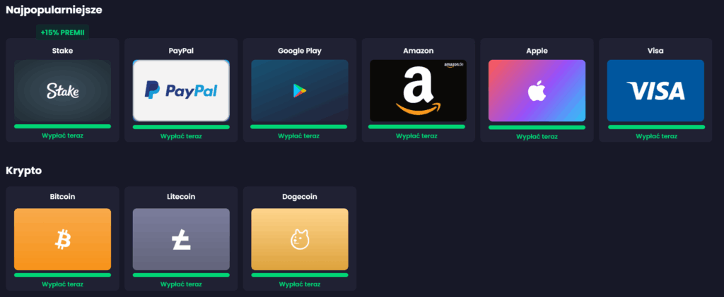 4️⃣ Dostępne środki możesz wypłacić w dowolnej formie: crypto (BTC, LTC, Doge), PayPay, Visa, Stake, Amazon, Apple. Minimum do pierwszej wypłaty wynosi 80 PLN, a wszystkie kolejne wypłaty są dostępne od 2 PLN. Pierwsze minimum do wypłaty można uzbierać bardzo szybko, dzięki promocjom i bonusom dla nowych użytkowników. Freecash zabezpiecza się w ten sposób przed użytkownikami, którzy rejestrują się, aby wypłacić od razu bonus powitalny – platforma chce zachęcić do pozostania z nimi na dłużej.