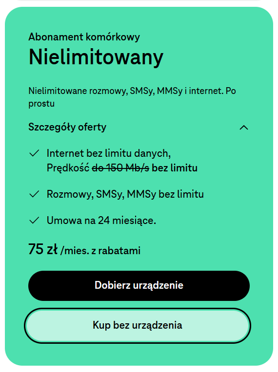 👉 Nielimitowana taryfa w ofercie abonamentowej za 75 zł/ miesięcznie (rozmowy/SMSy/internet bez limitu prędkości i bez limitu danych)!