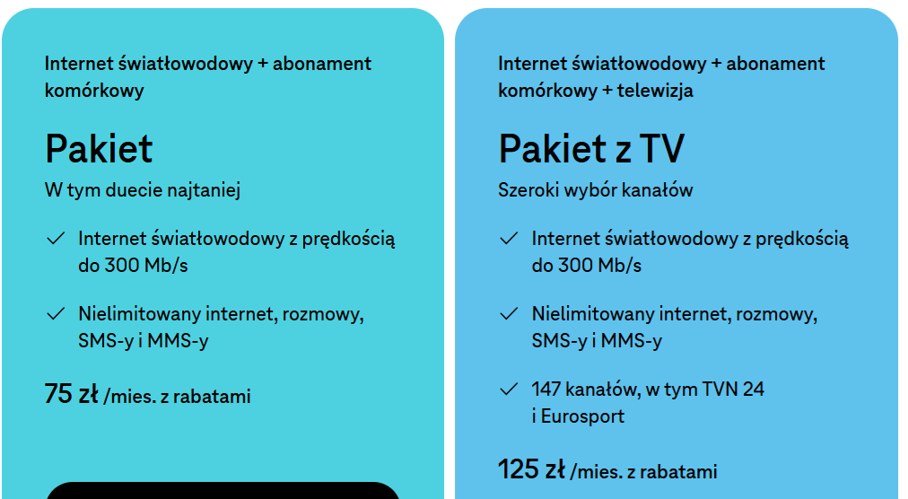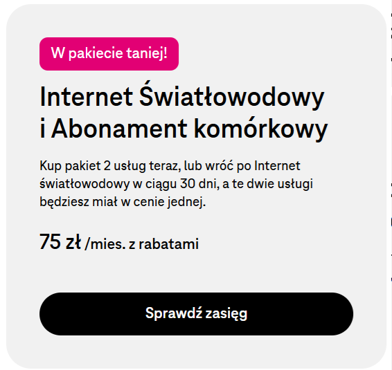 👉 Dwie usługi w cenie jednej: nielimitowana taryfa w ofercie abonamentowej + internet światłowodowy do 300mb/s łącznie za 75 zł/miesięcznie!