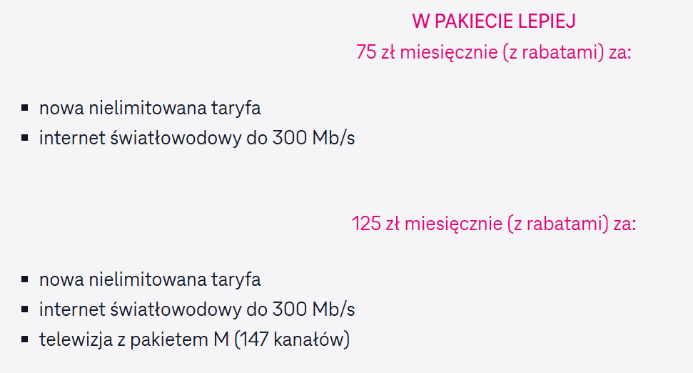 Osoby, które poszukują zarówno nielimitowanego internetu w smartfonie, jak i solidnego internetu światłowodowego do domu (do 300 Mb/s), z pewnością będą zadowolone z połączenia tych dwóch usług w T-Mobile. Decydując się na pakiet tych rozwiązań, użytkownik zapłaci łącznie 75 zł miesięcznie (z rabatami).
